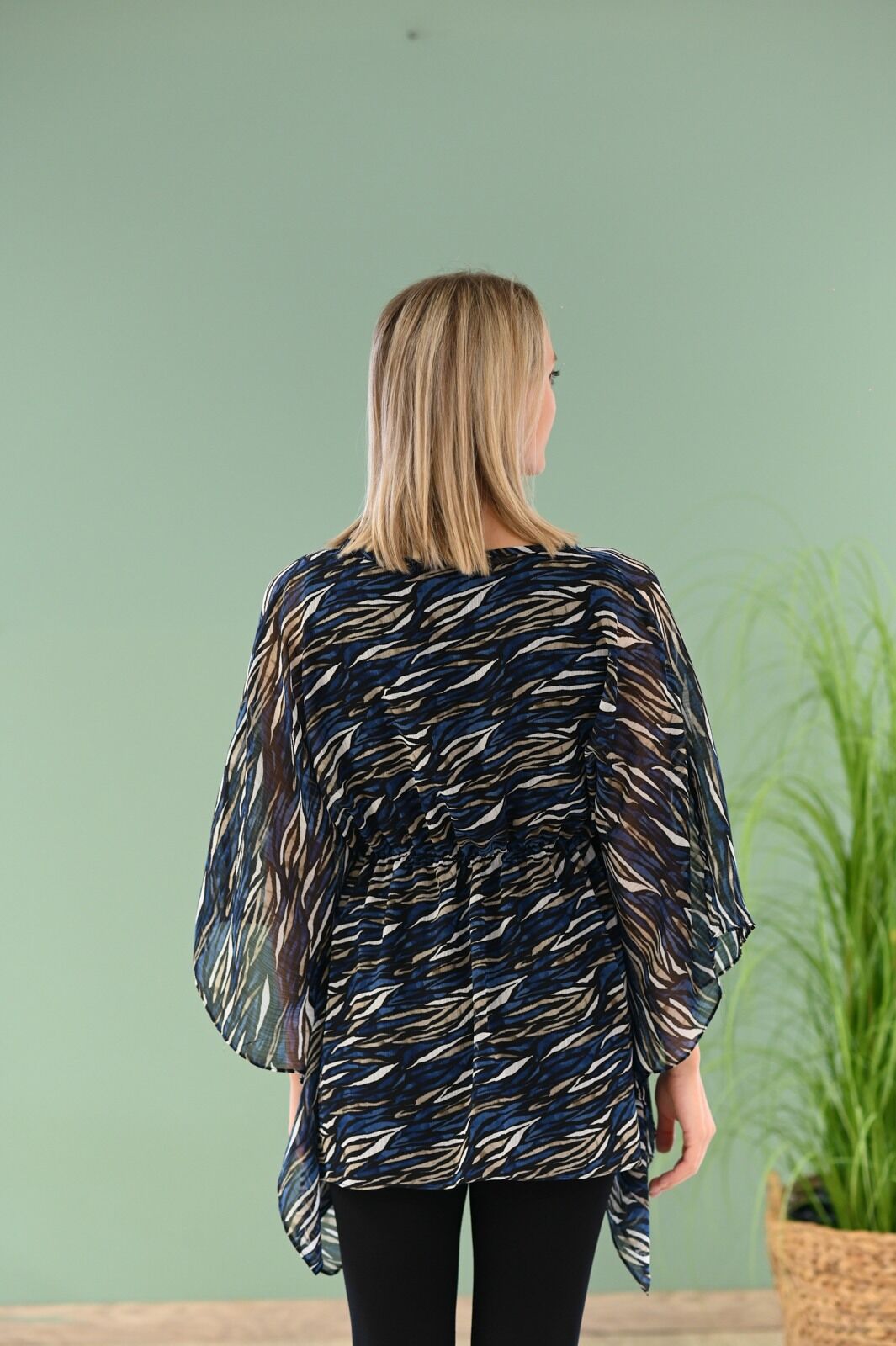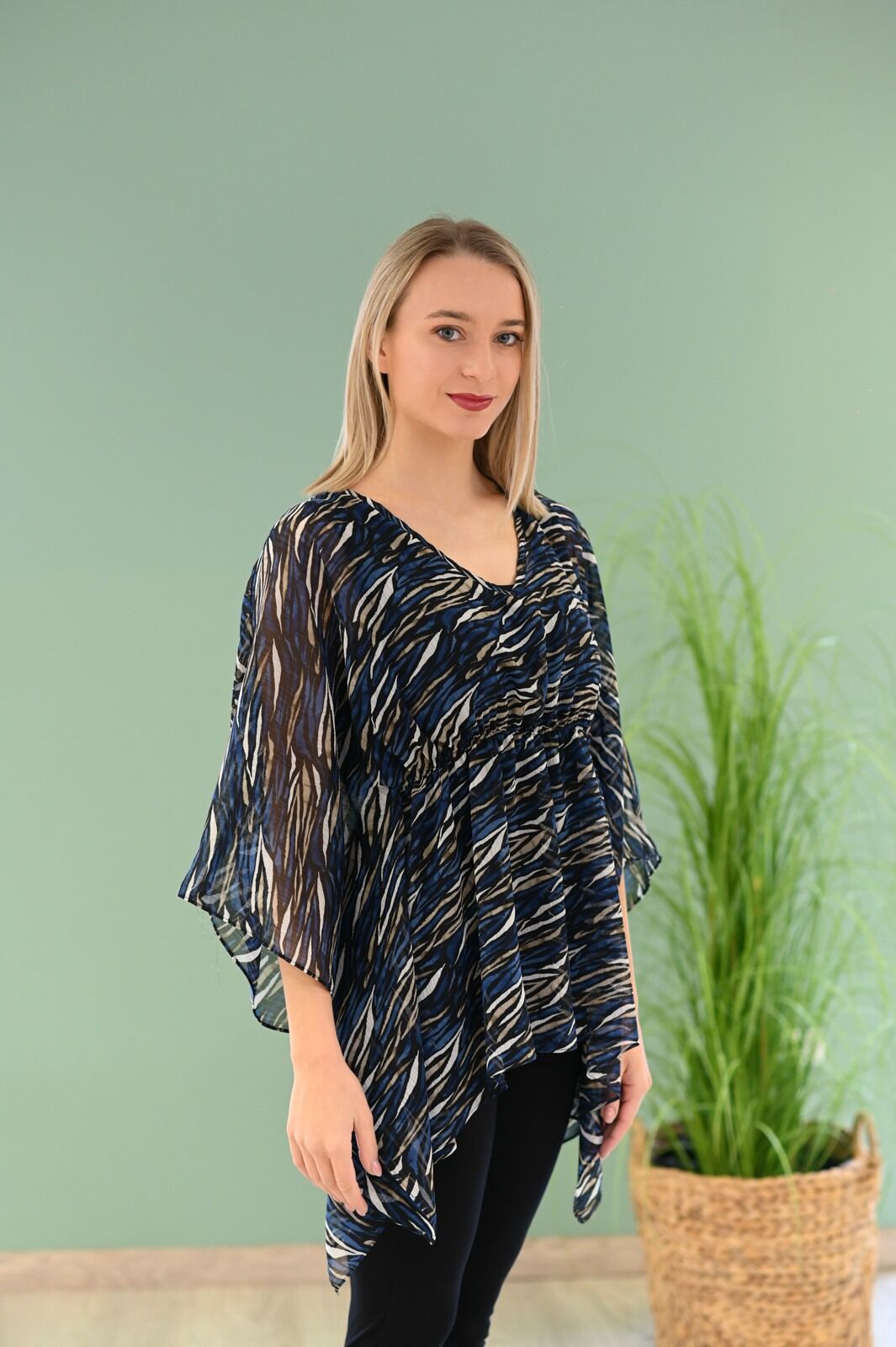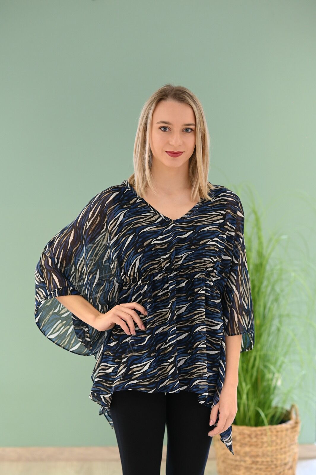 Αναδείξτε το στυλ σας με αυτή τη μοντέρνα και κομψή μπλούζα από ύφασμα ζορζέτα, με εντυπωσιακό εμπριμέ μοτίβο σε αποχρώσεις μαύρου και μπλε.